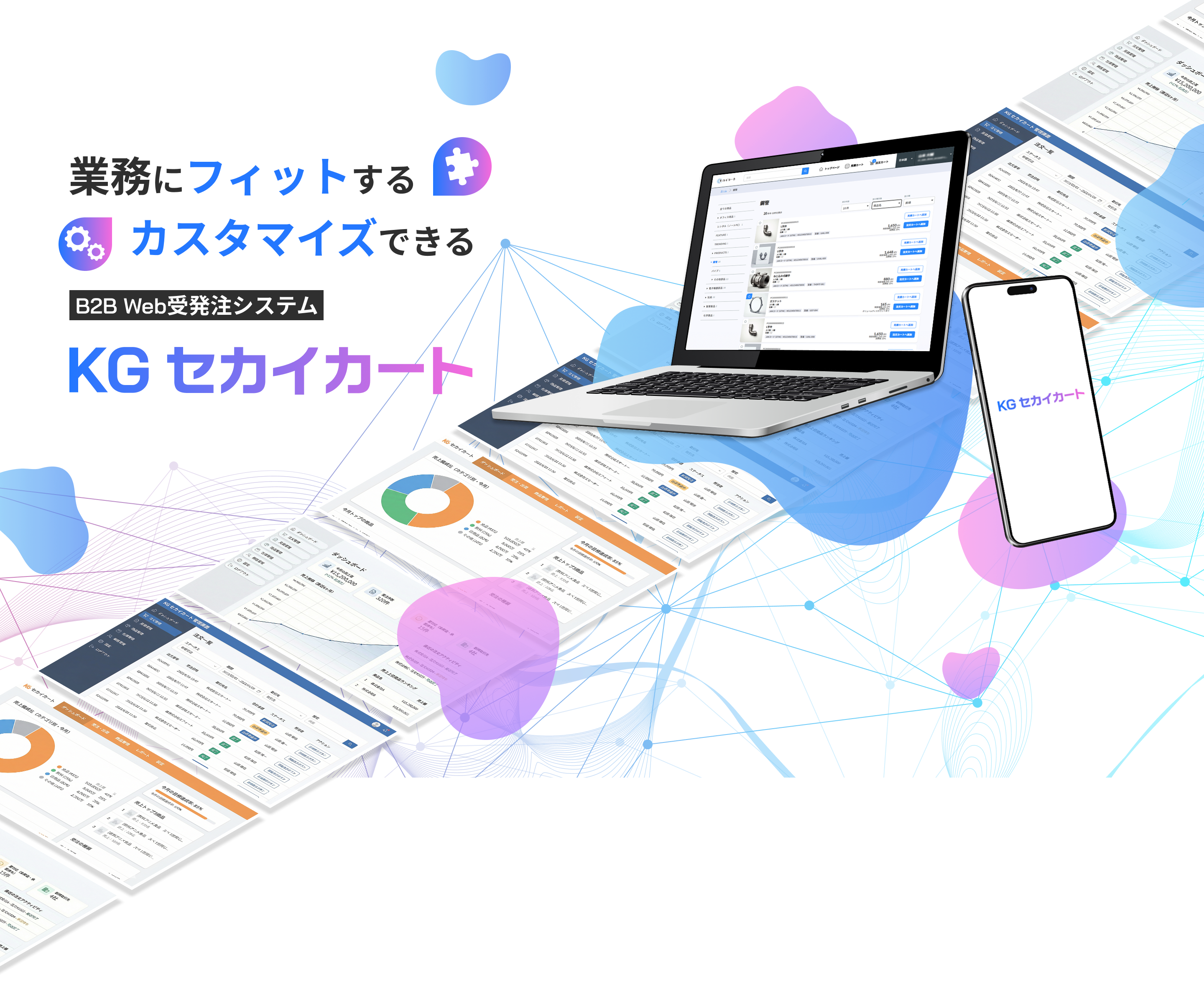 KGセカイカートは、こうした課題を解決するカスタマイズ可能なSaaS型BtoB受発注システムです。SaaS型サービスでありながら柔軟なカスタマイズに対応し、企業ごとの業務フローや取引条件に合わせたシステム構築が可能です。また、メンテナンスの負荷を抑えながら継続的に利用できます。まずは標準構成でリーズナブルに導入し、受発注業務のデジタル化を推進。その後、運用定着に合わせて機能拡張や個別案件への対応を行うことで、段階的な業務効率化を可能にします。
